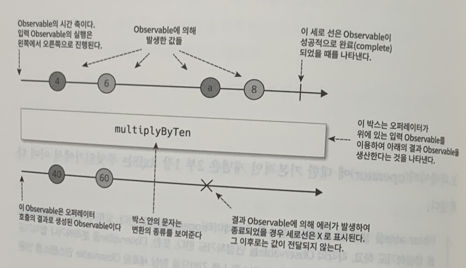 - 입력 Observable을 기반으로 multiplyByTen 오퍼레이터가 적용되어 새로운 경과 Observable이 생성됨